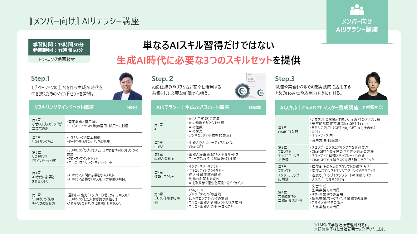 - リスキリング・マインドセットを重視し、現場で活かせる学びを設計。